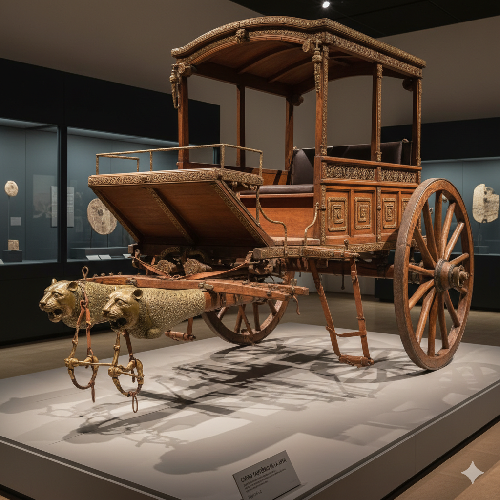 El Carro de La Joya es el resto de un vehículo ceremonial o de prestigio, datado en el siglo VII a.C., hallado en la tumba de élite n.º 17 de la necrópolis tartésica de La Joya (Huelva). Su importancia radica en que las piezas de bronce conservadas, incluyendo cabezas de felino decorativas y elementos funcionales (como bocados para los caballos), sugieren que este carro no solo era un símbolo de alto estatus de la aristocracia tartésica, sino que incorporaba un avanzado y posiblemente el más antiguo sistema de suspensión conocido en Occidente, lo que evidencia la gran sofisticación tecnológica de la ingeniería y la metalurgia de esta enigmática civilización. La réplica del carro es el centro de la exposición "La Joya: vida y eternidad en Tarteso" en el Museo de Huelva, donde se muestra al público por primera vez el vehículo montado a escala real. La imagen que se muestra ha sido generada por la IA.
