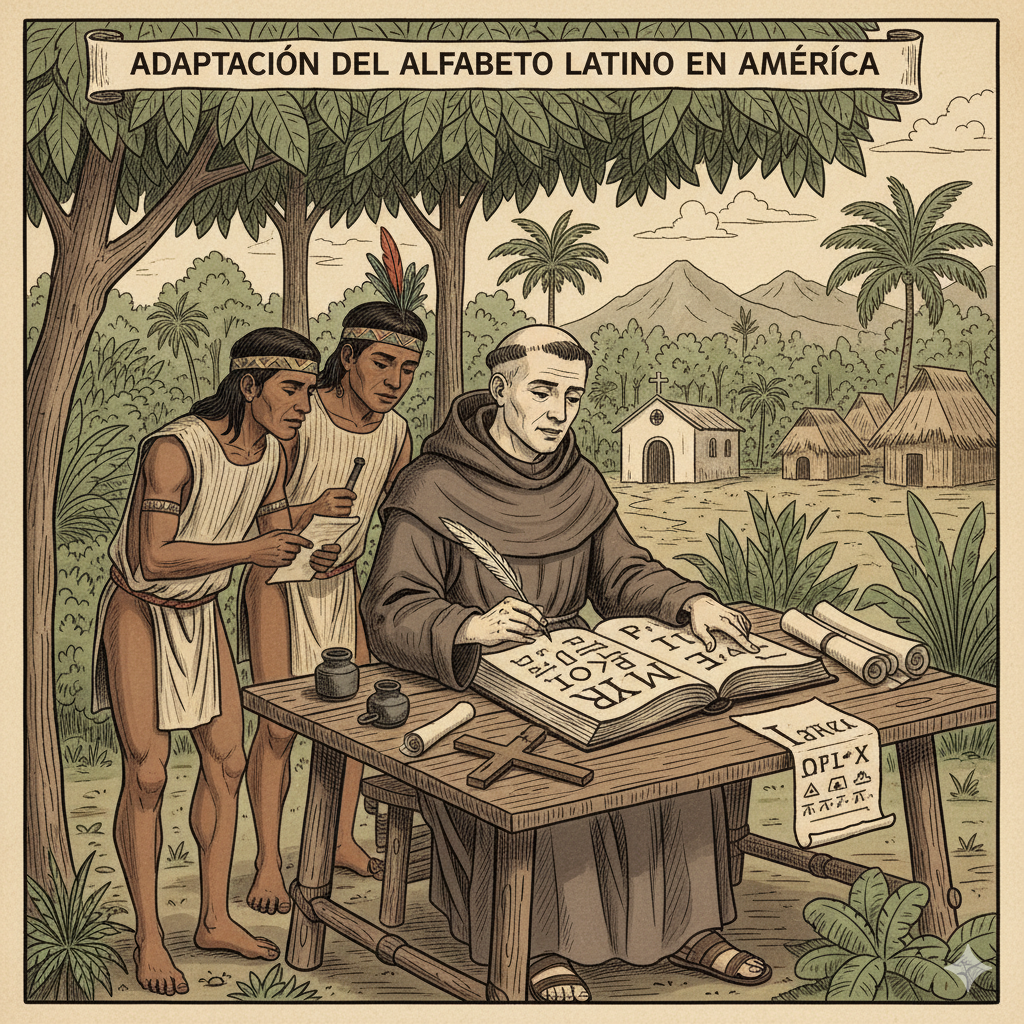 El sistema para dotar de escritura a las lenguas ágrafas en América fue implementado por la monarquía hispánica, principalmente a través de misioneros y religiosos durante el periodo colonial. El método consistió en la adaptación del Alfabeto Latino para transcribir los sonidos de lenguas indígenas como el náhuatl, el quechua o el guaraní. El objetivo principal fue la evangelización, lo que llevó a la creación de las primeras gramáticas y diccionarios de estas lenguas, dotándolas de un sistema escrito que fue crucial para su documentación y preservación histórica hasta la actualidad. Para representar estos sonidos, los frailes tuvieron que ingeniárselas, a menudo usando letras o combinaciones de letras de forma innovadora (por ejemplo, usando "tl" para el sonido náhuatl /t͡ɬ/ o empleando letras acentuadas). Estas adaptaciones dieron lugar a las primeras gramáticas y diccionarios de lenguas americanas, como las escritas por Fray Alonso de Molina (náhuatl) o Fray Domingo de Santo Tomás (quechua).