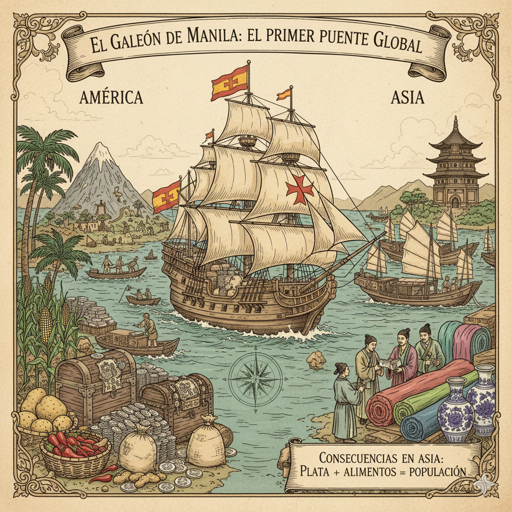 El intercambio colombino entre América y Asia fue catalizado por la Corona Española a través de la ruta del Galeón de Manila (1565-1815), que conectaba Acapulco con Filipinas y, desde allí, con el resto de Asia, creando la primera ruta comercial verdaderamente global. Desde América, el principal producto de exportación fue la plata (especialmente de Potosí), la cual fue esencial para monetizar la economía de la China Imperial e integrarla al comercio mundial. Adicionalmente, esta ruta facilitó la rápida introducción de cultivos americanos como el maíz, la patata, el tabaco, la calabaza, la piña, el cacahuete y el chile. La adopción masiva de estos cultivos en Asia, particularmente en China, tuvo la consecuencia de reforzar la seguridad alimentaria al poder crecer en tierras marginales, lo que fue un factor clave que permitió y sustentó un crecimiento demográfico explosivo en el continente durante los siglos posteriores durante los siglos XVII, XVIII y XIX.