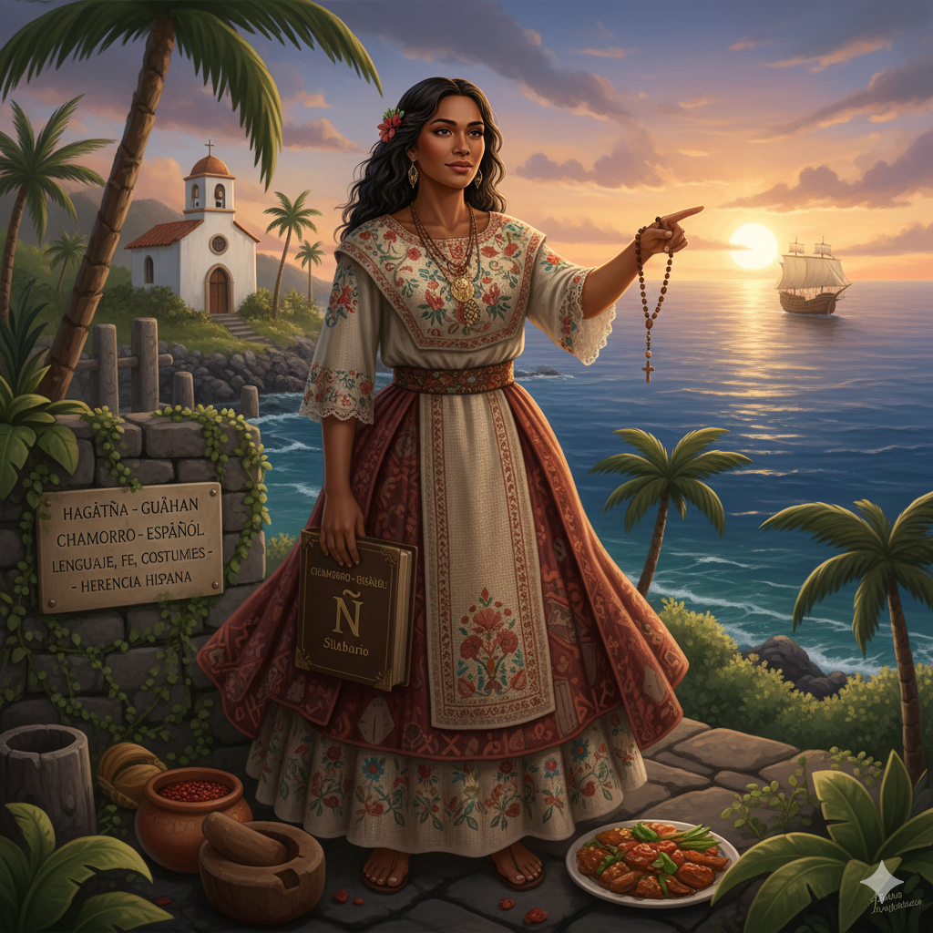 La influencia de España en el Pacífico Oriental estuvo marcada por la necesidad estratégica de proteger la ruta comercial del Galeón de Manila, que conectaba Filipinas con México (Acapulco) durante 250 años (1565-1815). Este enfoque en la logística y la soberanía nominal, más que en la colonización intensiva, definió la presencia en islas como las Marianas, las Carolinas (incluyendo Palaos) y la exploración de Nueva Guinea. Las Islas Marianas, fueron el punto neurálgico y sirvieron como escala vital de reabastecimiento para los galeones, lo que llevó a una presencia misional y militar más sostenida, particularmente en Guam. Este contacto prolongado dejó un profundo legado cultural y lingüístico en el pueblo Chamorro, cuya lengua adoptó masivamente vocabulario y estructuras del español y del español novohispano (mexicano), resultando en que más de la mitad de sus palabras son de origen castellano. Además de esta influencia lingüística única, la herencia española se manifiesta en la práctica casi universal de la fe católica, en la presencia de apellidos españoles y en la integración de técnicas y platillos hispanos y mexicanos en su gastronomía tradicional. Aunque gran parte de la arquitectura histórica fue destruida durante la Segunda Guerra Mundial, quedan restos y reconstrucciones de iglesias y estructuras coloniales, especialmente en Agaña, (Hagåtña), la capital de Guam. España tuvo un papel crucial en el descubrimiento y el nombramiento de otras grandes islas y archipiélagos como Taiwan, Islas Salomón y Vanuatu, Islas Molucas (Islas de las Especias), Isla de Célebes, Tahití, Norte de Borneo, Islas Marquesas, Isla de Pascua, Islas de la Melanesia y la Polinesia y también tuvo derechos de asentamientos en territorios del imperio portugués en Asia.