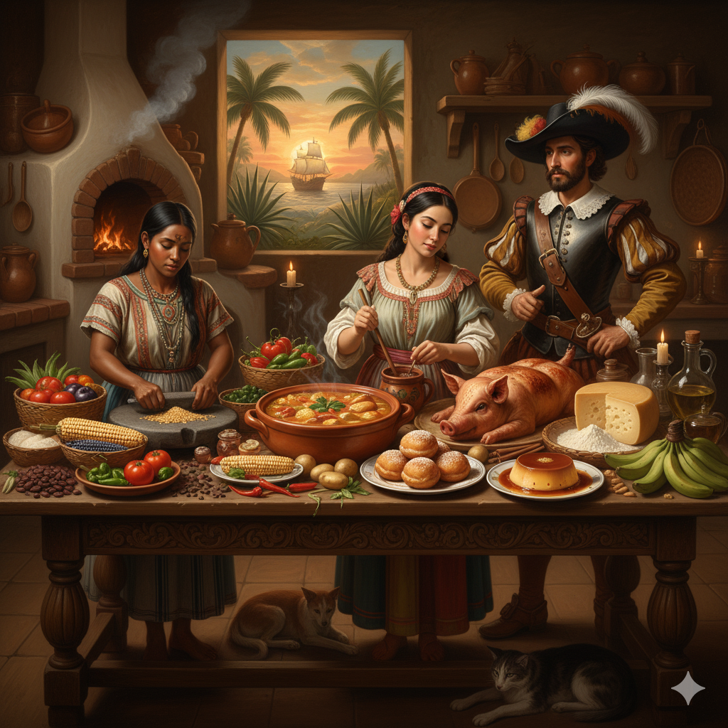La cocina americana se define por la fusión catalizada por la influencia española, que introdujo elementos esenciales que reestructuraron la dieta indígena, creando la base del mestizaje culinario que caracteriza a América Latina. Los colonizadores trajeron animales domésticos fundamentales como el cerdo y el ganado vacuno, que se convirtieron en la principal fuente de proteínas y grasa; cereales como el trigo y el arroz, que se volvieron omnipresentes en la alimentación; y la trilogía de la sazón: ajo, cebolla y aceite/manteca, junto con especias clave como el comino y la canela. En términos de técnica, España popularizó el sofrito como base aromática para guisos y arroces, y la repostería se transformó con el uso del horno, dando origen a postres icónicos como el flan y el arroz con leche. Esta nueva despensa y estas técnicas se combinaron hábilmente con los ingredientes nativos (maíz, tomate, chile, patata) para generar platos criollos complejos y diversos, desde el sancocho hasta el mole, marcando indeleblemente la identidad gastronómica del continente.