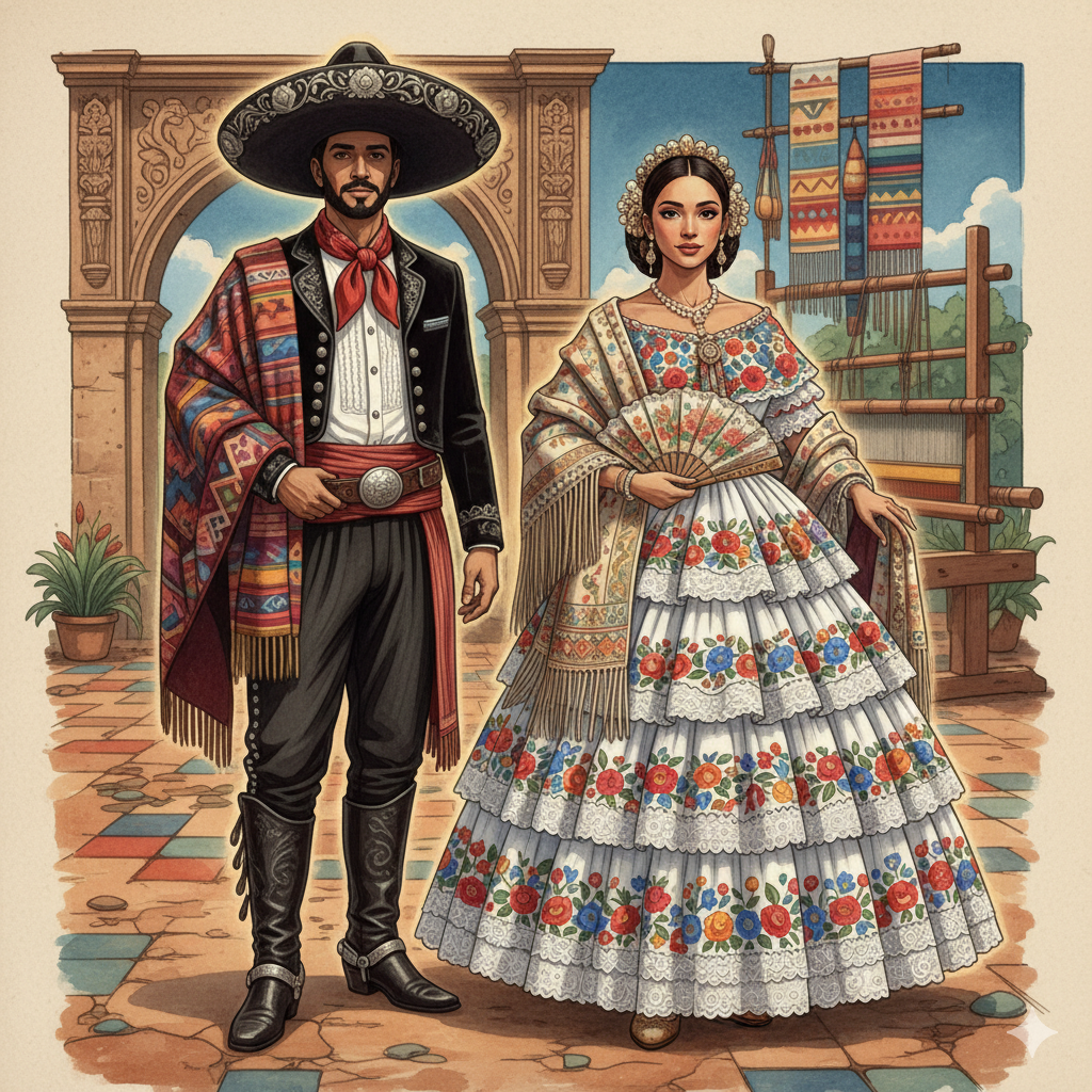 La configuración de la vestimenta folclórica hispanoamericana es el resultado de una profunda y duradera fusión cultural iniciada en la época colonial, donde la indumentaria española actuó como catalizador. España introdujo un nuevo paradigma de vestuario, tanto en el ámbito formal como en el de la ropa de trabajo, que contrastaba con las tradiciones prehispánicas. Específicamente, en la moda masculina, se introdujeron prendas europeas como la chaqueta (que dio origen al término "americana"), el concepto de la camisa de algodón o lino, y el pantalón/calzón; estas se adaptaron rápidamente a las necesidades de la vida ecuestre y campesina, influyendo en trajes icónicos como los del gaucho, el llanero y el charro. En el ámbito femenino, la influencia se centró en la estructura del vestido: la pollera, derivada del faldellín y la saya española, se convirtió en una prenda fundamental, especialmente en los Andes, y se complementó con la enagua para dar volumen, ambas a menudo adornadas con encajes y volantes inspirados en la moda ibérica. Crucialmente, esta adopción no fue una mera réplica, sino una síntesis creativa donde las prendas españolas se encontraron con la maestría textil indígena, incorporando lanas de oveja, algodón local y técnicas de bordado coloridas, dando origen a atuendos distintivos como el poncho o las lujosas polleras panameñas, que hoy representan la identidad mestiza y el patrimonio cultural de cada nación.