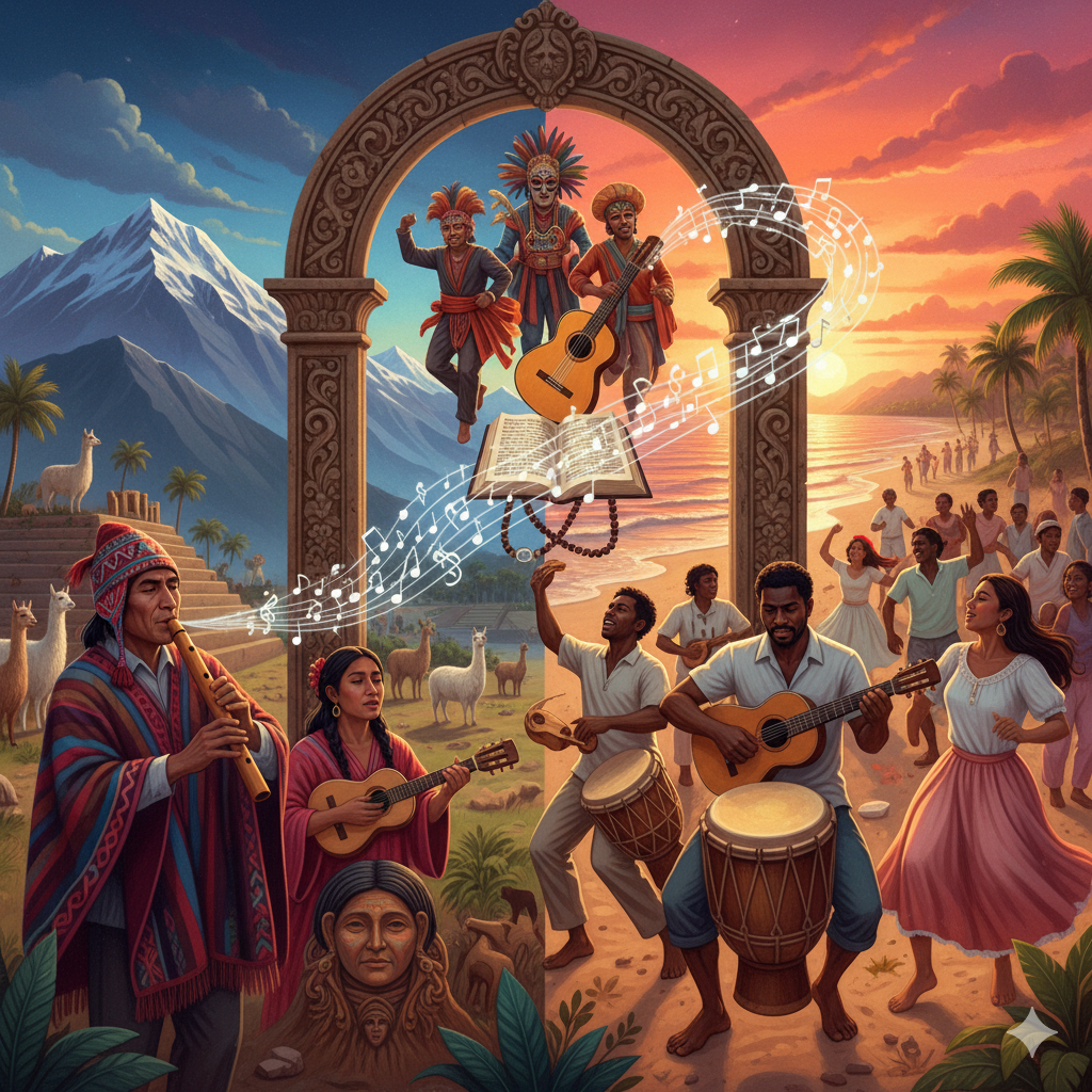 La influencia española es el pilar fundamental sobre el que se erigió el folclore hispanoamericano, actuando como el principal agente de mestizaje cultural al fusionar sus propias tradiciones con las prácticas indígenas y, en las costas, con la cultura africana, resultando en un crisol de expresiones únicas; esta herencia es palpable desde la música, donde la guitarra española se convirtió en el instrumento rey (originando variantes como el charango o el cuatro) y proveyendo estructuras poéticas esenciales como la décima (central en la payada o el punto cubano) y la copla, formas que estructuran narrativas orales y cantos populares como el corrido, mientras que danzas de salón peninsulares como el fandango o la jota sentaron las bases coreográficas y rítmicas para bailes nacionales icónicos como la cueca, la zamba y la marinera. El folclore andino es un diálogo introspectivo entre la flauta indígena y la cuerda criolla, el folclore caribeño es una conversación exuberante entre la guitarra española y los tambores africano; asimismo, la religión católica, impuesta por los españoles, es el eje central de innumerables celebraciones folclóricas, desde las procesiones de Semana Santa hasta las festividades patronales y romerías, y la literatura oral, por su parte, adoptó cuentos, leyendas y un extenso refranero común de origen europeo, consolidando así un folclore criollo que es, esencialmente, la síntesis viva de tres continentes.