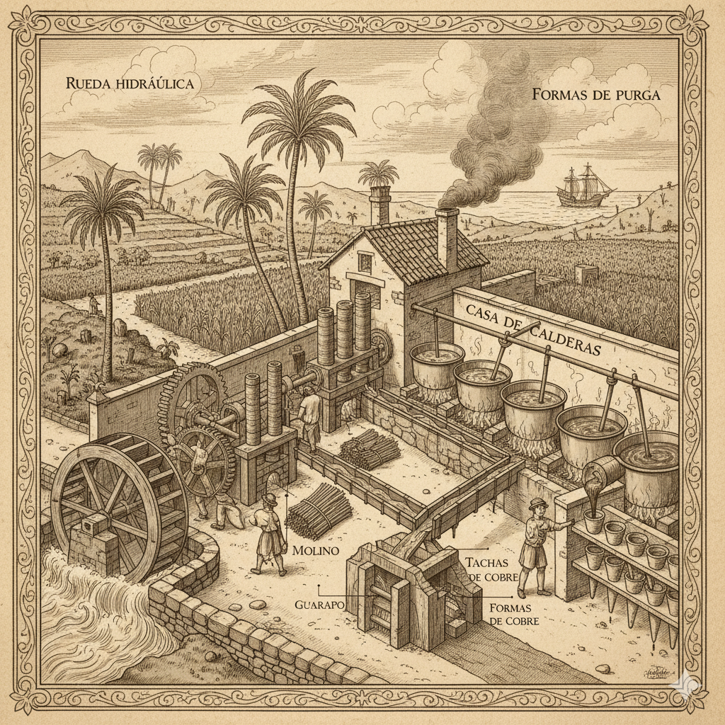Los ingenios azucareros de Canarias, que florecieron desde finales del siglo XV hasta el XVII, representan un hito en la ingeniería agroindustrial atlántica, siendo el motor de la primera gran industria de exportación de la Corona de Castilla, basada en el codiciado "oro blanco". Estos complejos eran centros mecánicos avanzados para su época, cuyo corazón era el molino, accionado principalmente por energía hidráulica, que utilizaba un ingenioso sistema de engranajes y rodillos para triturar la caña y extraer el guarapo. Posteriormente, este jugo pasaba a una casa de calderas donde, mediante un proceso de cocción intensiva y purificación, se transformaba en panes de azúcar, demostrando un dominio de la logística industrial, el control de la temperatura y la gestión de la energía a gran escala. Actualmente, varios de sus restos arqueológicos, como los de Agaete o Los Picachos, forman parte de una candidatura a Patrimonio Mundial de la UNESCO, reconociendo su papel como precursores de la globalización comercial y la innovación tecnológica.