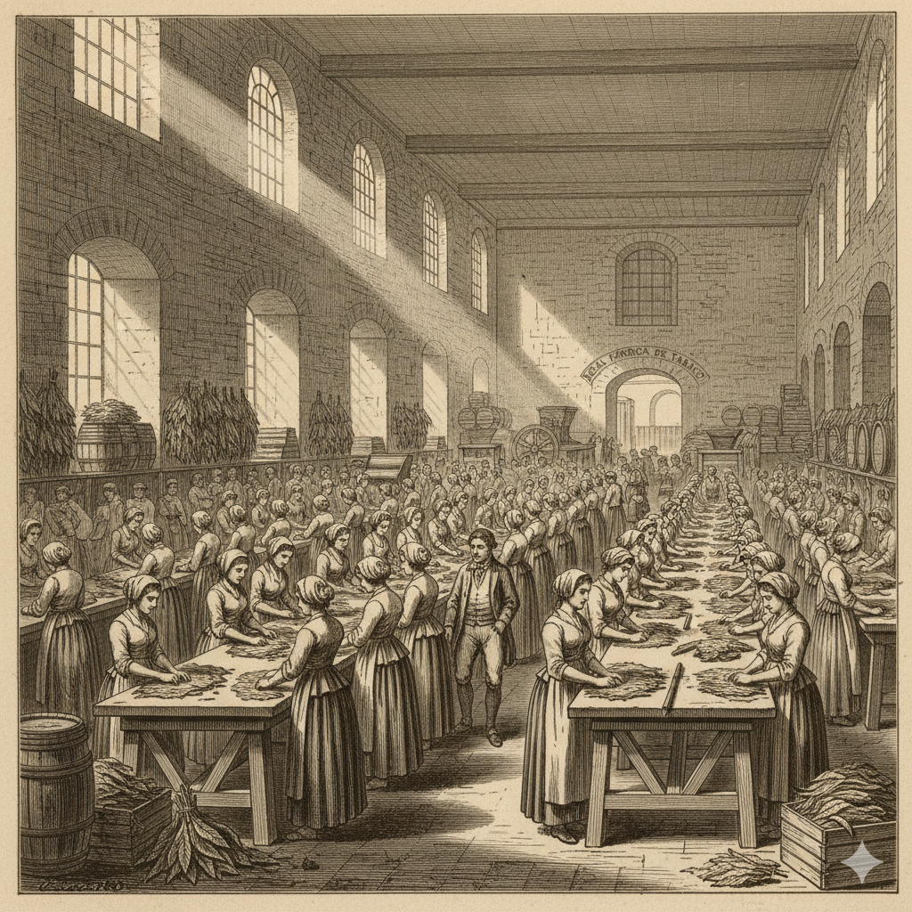 Las fábricas pioneras de tabaco en Hispanoamérica, conocidas como Reales Fábricas, surgieron en la segunda mitad del siglo XVIII como herramienta clave de las Reformas Borbónicas para establecer un Estanco Real (monopolio estatal) y maximizar la recaudación fiscal de la Corona. Estos establecimientos, siendo de los primeros ejemplos de producción industrial a gran escala en el continente, se concentraron en grandes capitales como Ciudad de México, Quito y Cartagena de Indias, donde se procesaba la hoja curada para elaborar puros, cigarros y rapé. Su impacto social fue notable al ser centros masivos de empleo, especialmente para mujeres asalariadas (las cigarreras), lo que representó un cambio pionero en la estructura laboral urbana de la época. Las Reales Fábricas de Tabaco fueron, en muchos casos, los primeros centros laborales urbanos que emplearon a miles de mujeres de forma asalariada.