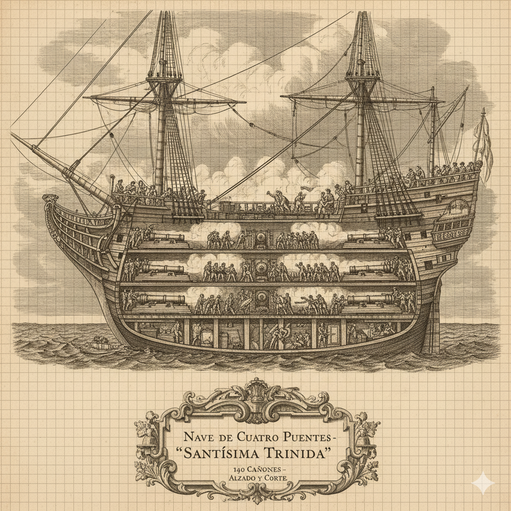 La importancia tecnológica de los navíos de cuatro puentes en España, ejemplificada por el colosal Navío Santísima Trinidad, radica en que constituyó un esfuerzo de la ingeniería naval del siglo XVIII por alcanzar la máxima concentración de poder de fuego, logrando ser el único buque operativo del mundo con cuatro cubiertas artilladas, portando hasta 140 cañones y convirtiéndose en un símbolo del poderío español; sin embargo, este diseño extremo puso a prueba las limitaciones estructurales de la tecnología de construcción en madera, ya que su inmenso tamaño y el peso añadido del cuarto puente causaron serios problemas de estabilidad, maniobrabilidad y una excesiva altura de borda que lo hacía lento y propenso a escora peligrosa, defectos que, si bien fueron objeto de costosas modificaciones de ingeniería (como el embonado del casco) para aumentar su manga, revelaron que la ambición de un buque tan grande excedía la capacidad técnica y material de la época.