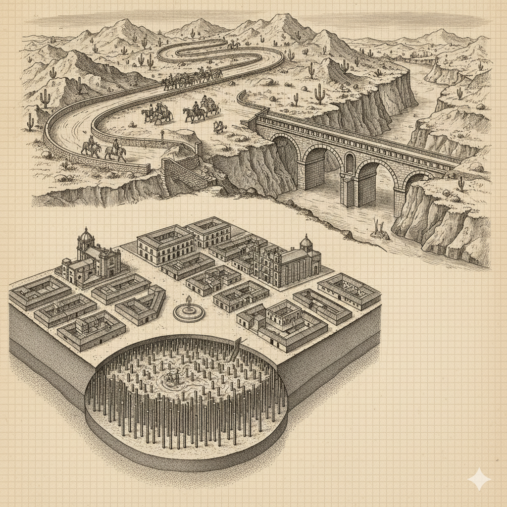 La ingeniería civil de la Nueva España se enfocó en integrar y estabilizar el vasto territorio mediante la Red de Caminos Reales, vastas arterias comerciales como el Camino de Tierra Adentro, cuya funcionalidad dependía de la construcción de duraderos puentes de mampostería con tecnología de arco de medio punto para asegurar el cruce de ríos y barrancos. En los núcleos urbanos, especialmente en la inestable cuenca lacustre de la Ciudad de México, la ingeniería se vio forzada a desarrollar técnicas avanzadas de cimentación profunda, utilizando pilotes de madera para transferir el peso de las estructuras a estratos de suelo firme, lo que garantizaba la estabilidad de palacios y catedrales. Simultáneamente, la planificación urbana se estandarizó bajo las Leyes de Indias, imponiendo la eficiente traza de damero (cuadrícula) para la fundación de nuevas ciudades, lo que simplificaba la distribución de solares y la expansión, a la par que se diseñaban las primeras infraestructuras de servicios urbanos como fuentes y sistemas básicos de alcantarillado.