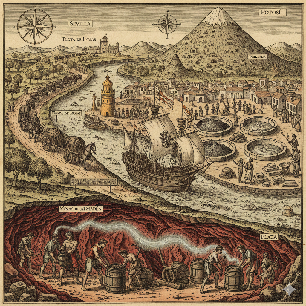 Las Minas de Almadén (Ciudad Real) son el yacimiento de mercurio más grande del mundo y se convirtieron en un recurso estratégico vital para la Corona española a partir de mediados del siglo XVI. Su importancia se disparó gracias al descubrimiento del método de amalgamación en 1554 por el sevillano Bartolomé de Medina en Nueva España (México). Este proceso químico, que utiliza el mercurio (conocido entonces como azogue) para extraer la plata de minerales de baja ley de forma más económica y eficiente, hizo que la demanda americana fuera gigantesca. Por orden de Felipe II, prácticamente toda la producción de Almadén se destinó a América, viajando por tierra hasta Sevilla y luego en las flotas transatlánticas hasta los centros mineros de Zacatecas (México) y, crucialmente, Potosí (Bolivia/Perú). Este flujo de mercurio actuó como el catalizador químico y económico que permitió que la plata americana fluyera caudalosamente hacia España, sustentando la economía de la monarquía durante la Edad Moderna.