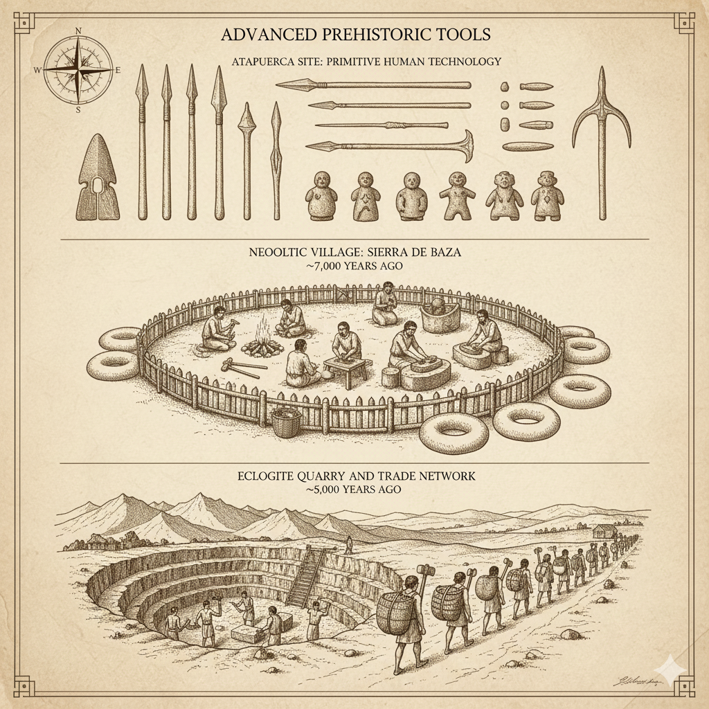 Las excavaciones en España han revelado una notable sofisticación tecnológica desde el Paleolítico Inferior, destacando en Orce 1.5 millones de años) la producción sistemática de herramientas de hueso (percutores y retocadores), un rasgo inusualmente temprano en Europa, y en Atapuerca y Barranc de la Boella el registro más antiguo de bifaces achelenses (1 millón de años), que demuestran una planificación superior en el tallado de la piedra. Más adelante, en el Neolítico, la Cueva de Los Murciélagos 7.000 años) ofreció el ajuar de arquero más antiguo de Europa, incluyendo cuerdas de arco de tendón y flechas emplumadas fijadas con brea de abedul (un adhesivo avanzado), adelantando la cronología europea en más de 2.000 años. En este lugar también se ha encontrado la cestería más antigua conservada en el sur de Europa, revelando una tecnología textil de fibras vegetales muy sofisticada por parte de sociedades que aún eran cazadoras-recolectoras. Las redes de distribución de herramientas pulimentadas de rocas especializadas como la eclogita demuestran una compleja organización logística y económica que cubría grandes distancias.