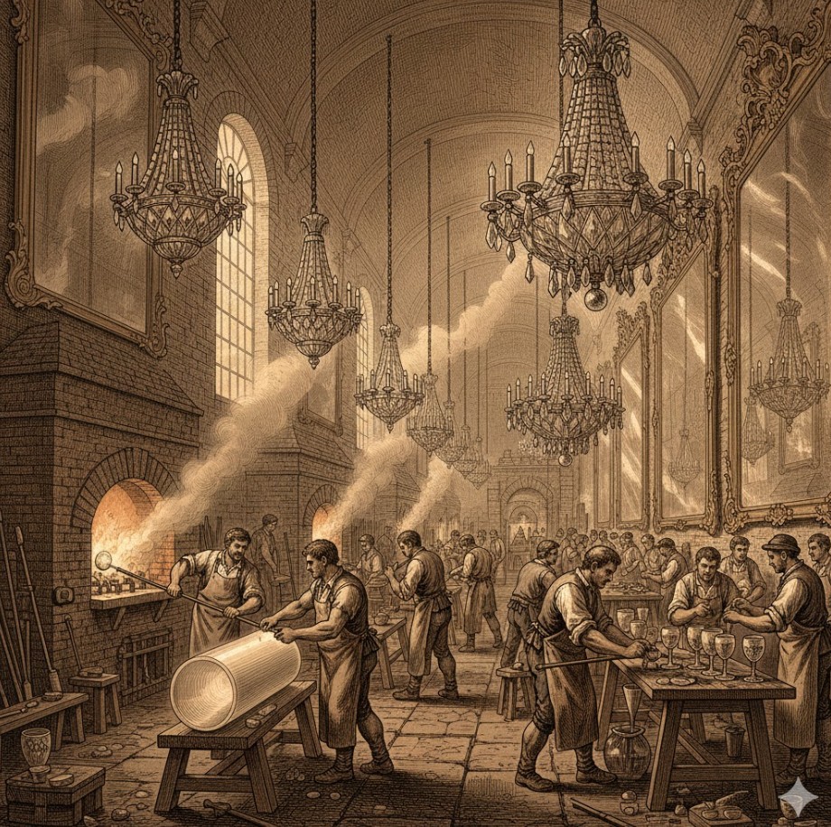 La Real Fábrica de Cristales de La Granja destacó por ser el máximo exponente de la industria de lujo de la Ilustración española, alcanzando fama mundial por su capacidad técnica para fabricar vidrios y espejos de dimensiones monumentales que eran el asombro de las cortes europeas. Su excelencia radicó en el perfeccionamiento del cristal de plomo, que permitía un tallado y grabado de una finura excepcional, y en el diseño de suntuosas lámparas de araña y vajillas que fusionaban la tradición artística con procesos de fabricación pre-industriales. El perfeccionamiento del tallado de diamante, una técnica de grabado profundo sobre cristal de plomo multiplicaba el brillo y los reflejos de la luz, elevando sus vajillas y piezas decorativas a la categoría de obras maestras de la ingeniería artesanal. Esta institución no solo fue un centro de producción, sino una auténtica escuela de diseño tecnológico que elevó el vidrio español a la altura de los mejores talleres de Bohemia y Venecia, manteniendo su prestigio hasta la actualidad.
