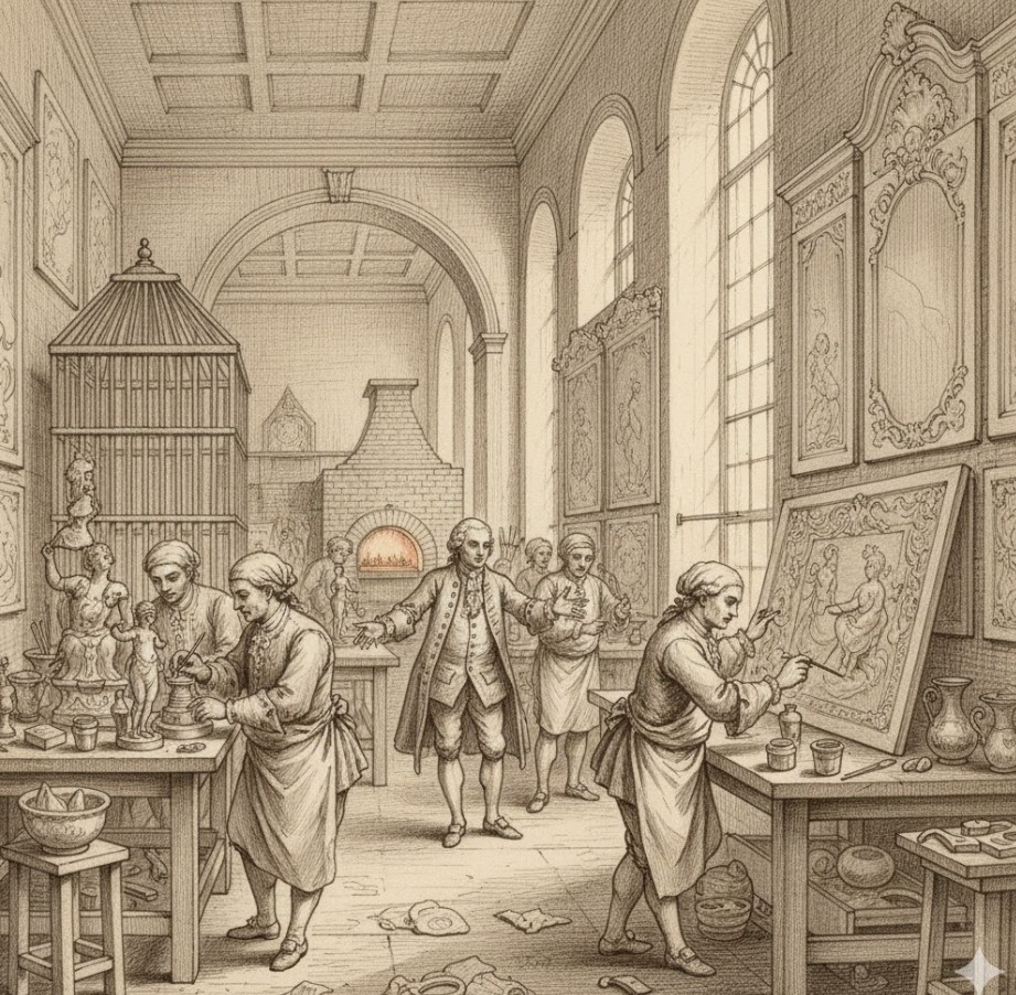 La Real Fábrica de Porcelana del Buen Retiro, fundada en 1760 por Carlos III, fue pionera absoluta en la introducción de la porcelana de "pasta tierna" en España, compitiendo en calidad y secretismo técnico con las manufacturas más prestigiosas de Europa como Sèvres o Capodimonte. Su mayor hito y carácter visionario residió en elevar este material de la categoría de objeto decorativo o vajilla a la de revestimiento arquitectónico integral, siendo la primera en crear los impresionantes "gabinetes de porcelana" donde paredes y techos se cubrían totalmente con placas cerámicas de intrincado diseño, logrando una fusión sin precedentes entre escultura, pintura y arquitectura de interiores. Además, la fábrica se distinguió por una autonomía artística extrema, ya que al ser una institución de prestigio real no sujeta a fines comerciales, pudo experimentar con pigmentos exclusivos, dorados de gran pureza y técnicas de modelado de gran formato que permitieron alcanzar un nivel de detalle y dinamismo en la escultura que marcó la cumbre del lujo neoclásico español.